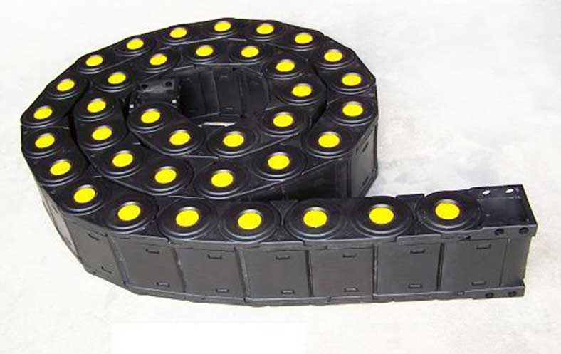 塑料拖鏈由兩個側鏈連接在一起,頂部和底部通過橋接件連接在一起。